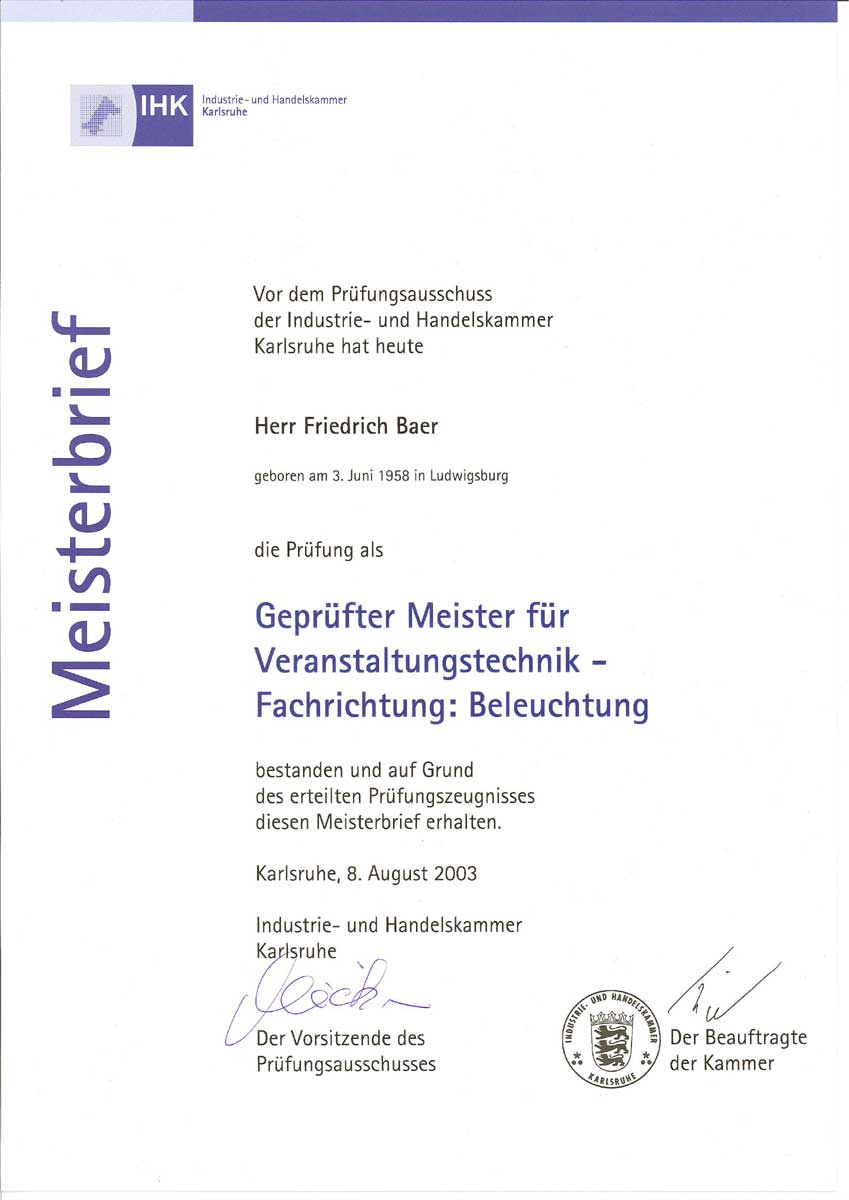 seit 2011 Meister für Veranstaltungstechnik (Fachrichtung Beleuchtung)